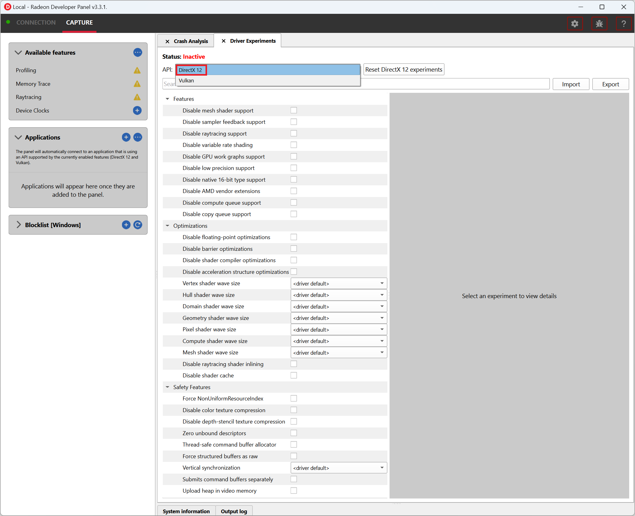 - 在 “Driver Experiments” 选项卡下,选择您要启用实验的 API (DirectX12 或 Vulkan)。