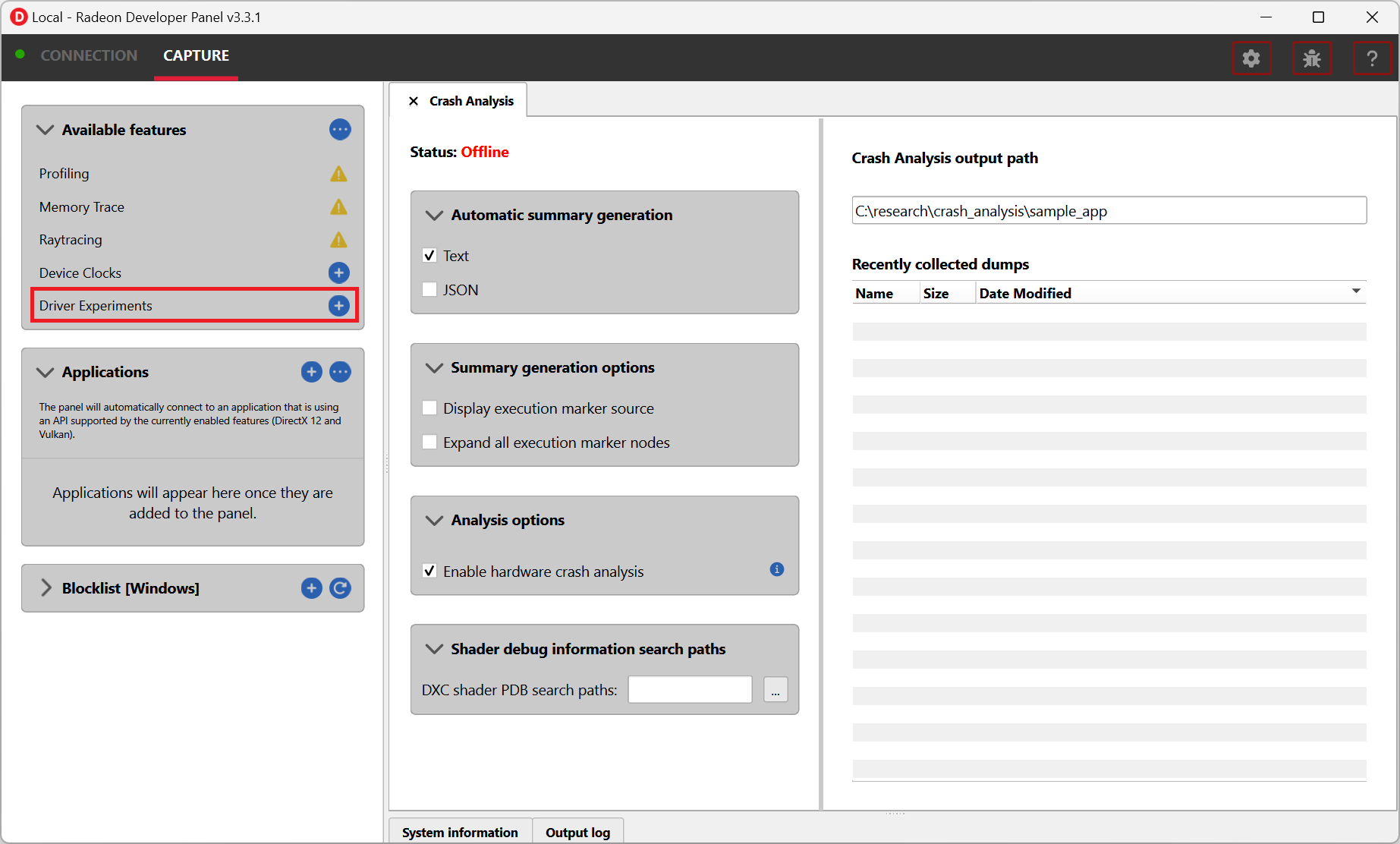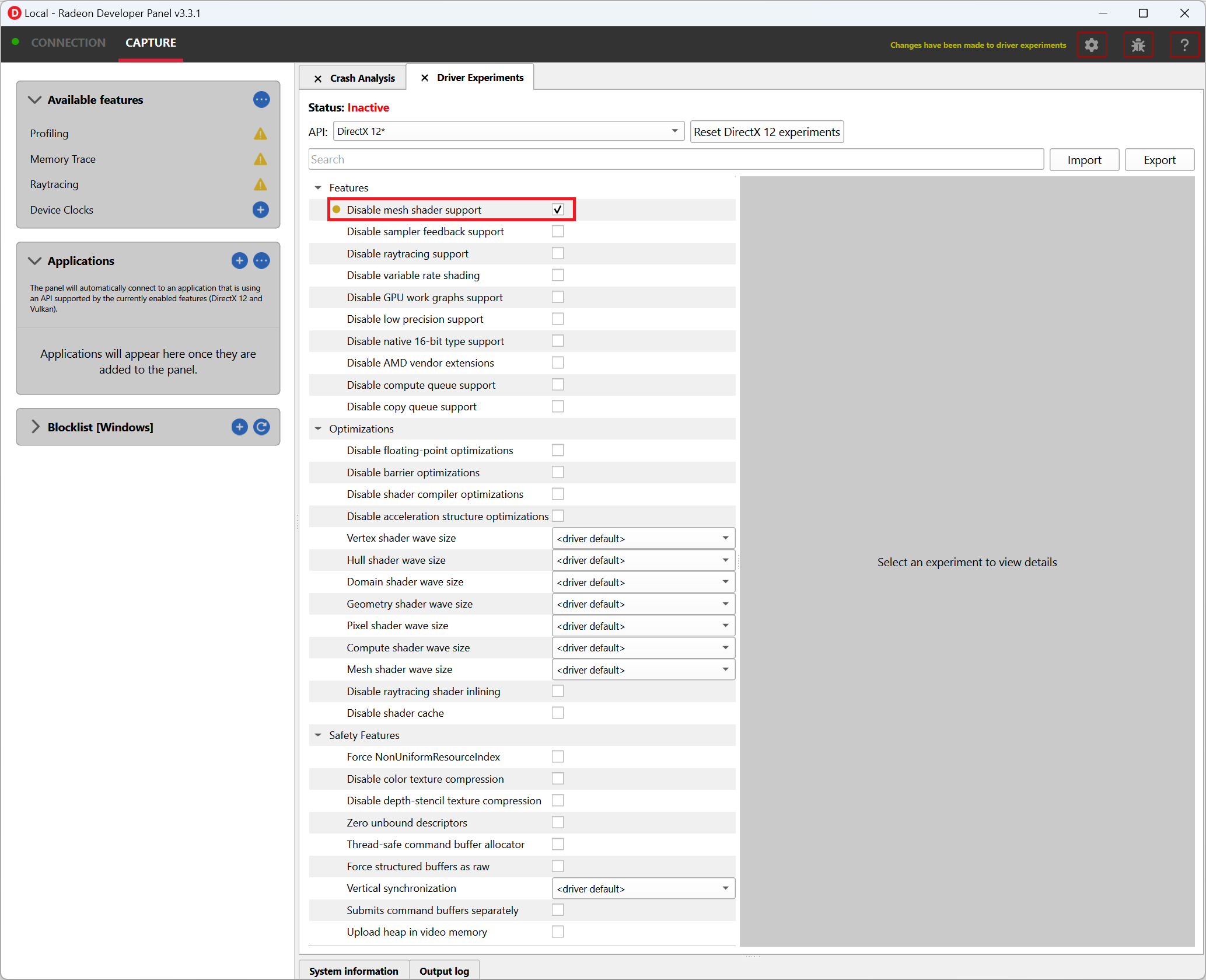 - 在 CAPTURE -> “Available features” 下,启用 “Driver Experiments”。