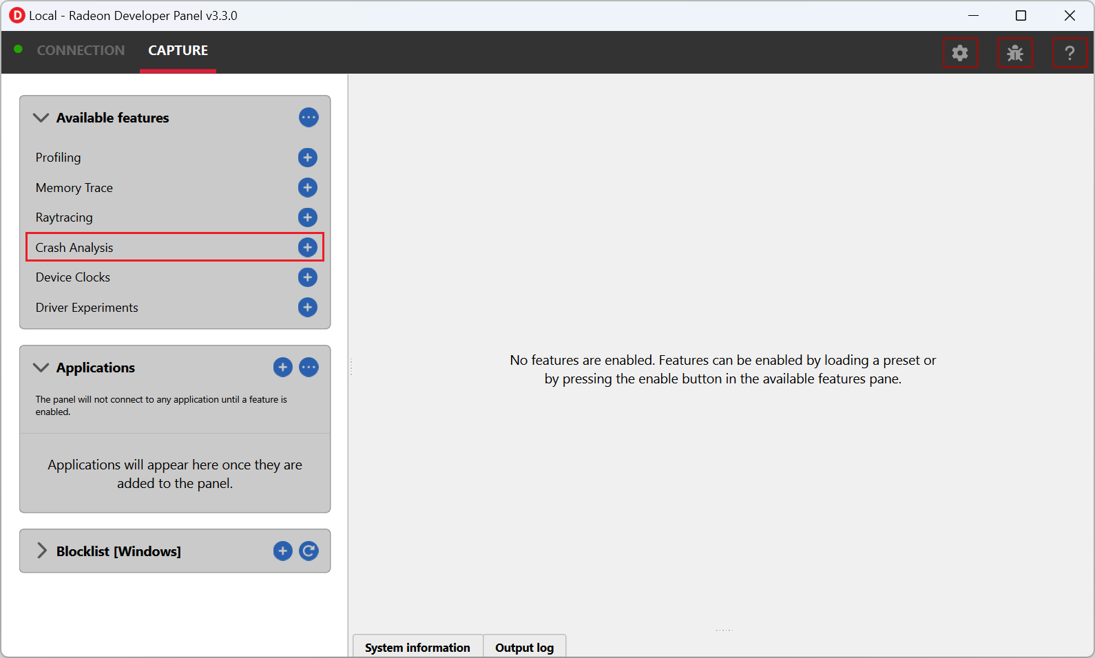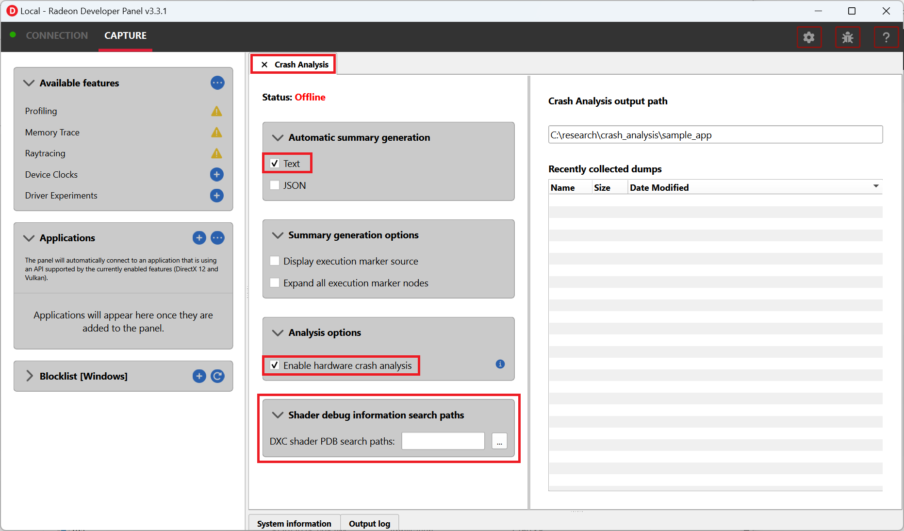 - 在 CAPTURE -> “Available features” 下,启用 “Crash Analysis”。
