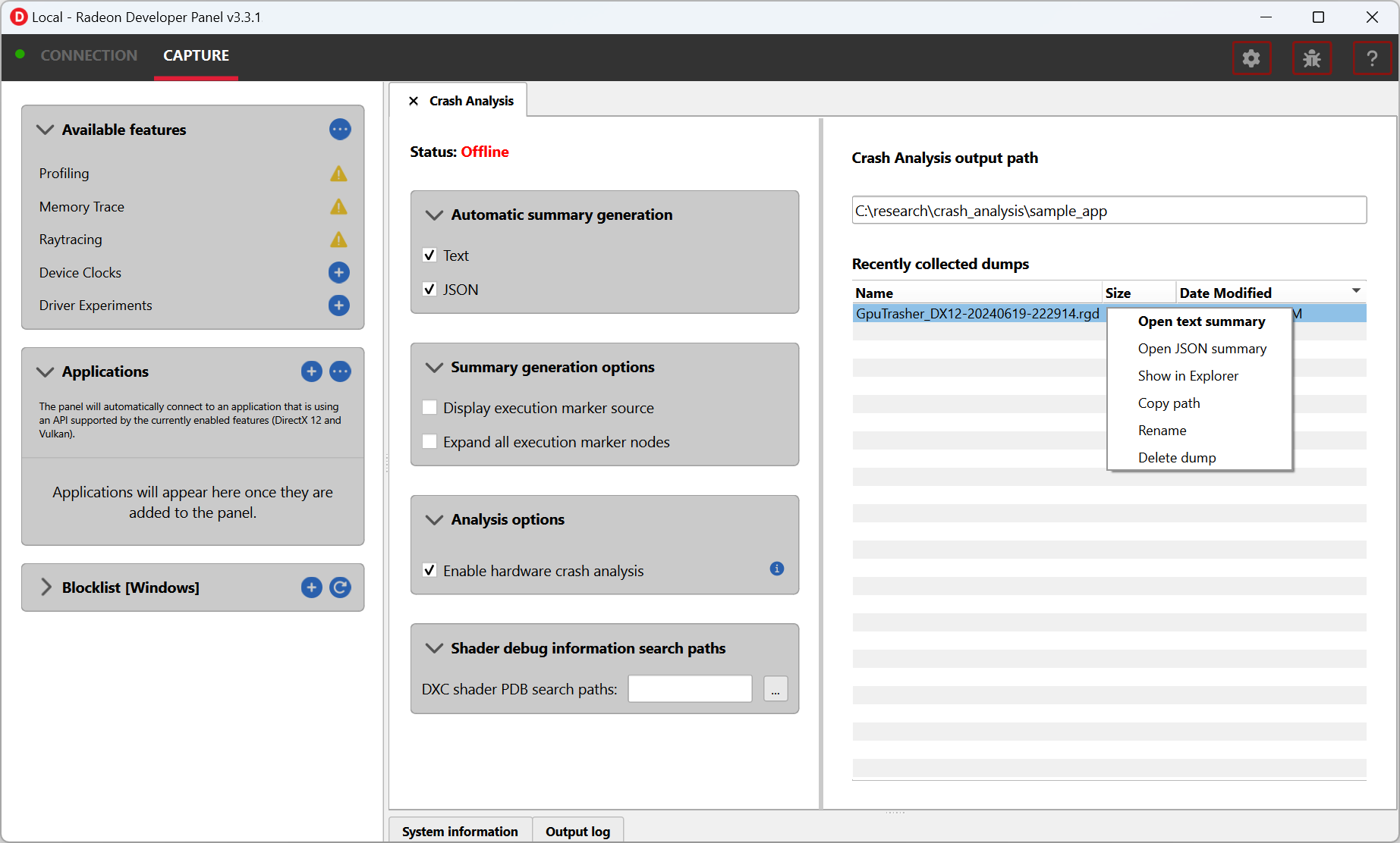 系统恢复后,如果检测到崩溃,您应该会在 “Recently collected dumps” 下看到一个新的 .rgd 文件。.rgd 文件是存储崩溃信息的二进制文件。RGD 不提供打开这些文件的 GUI 工具。相反,您可以直接从 RDP 将它们转换为文本或 JSON 格式的报告。为此,请右键单击并选择 “Open text summary”。