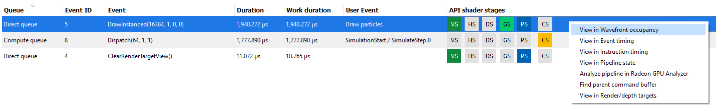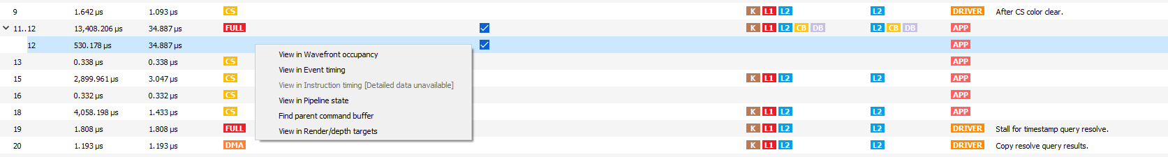用户还可以右键单击任何行,导航到 Wavefront Occupancy、Event Timing 或 Pipeline State 窗格,并在这些窗格以及侧边面板中查看所选行代表的事件。下面是右键单击上下文菜单样子的截图。