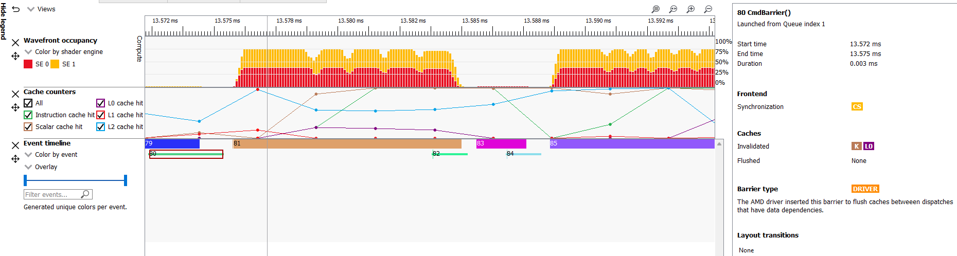 OpenCL 命令队列按顺序处理分派,并且后续内核分派通常使用前一个内核分派的结果。因此,可以预期 RGP 配置文件将包含大量屏障。