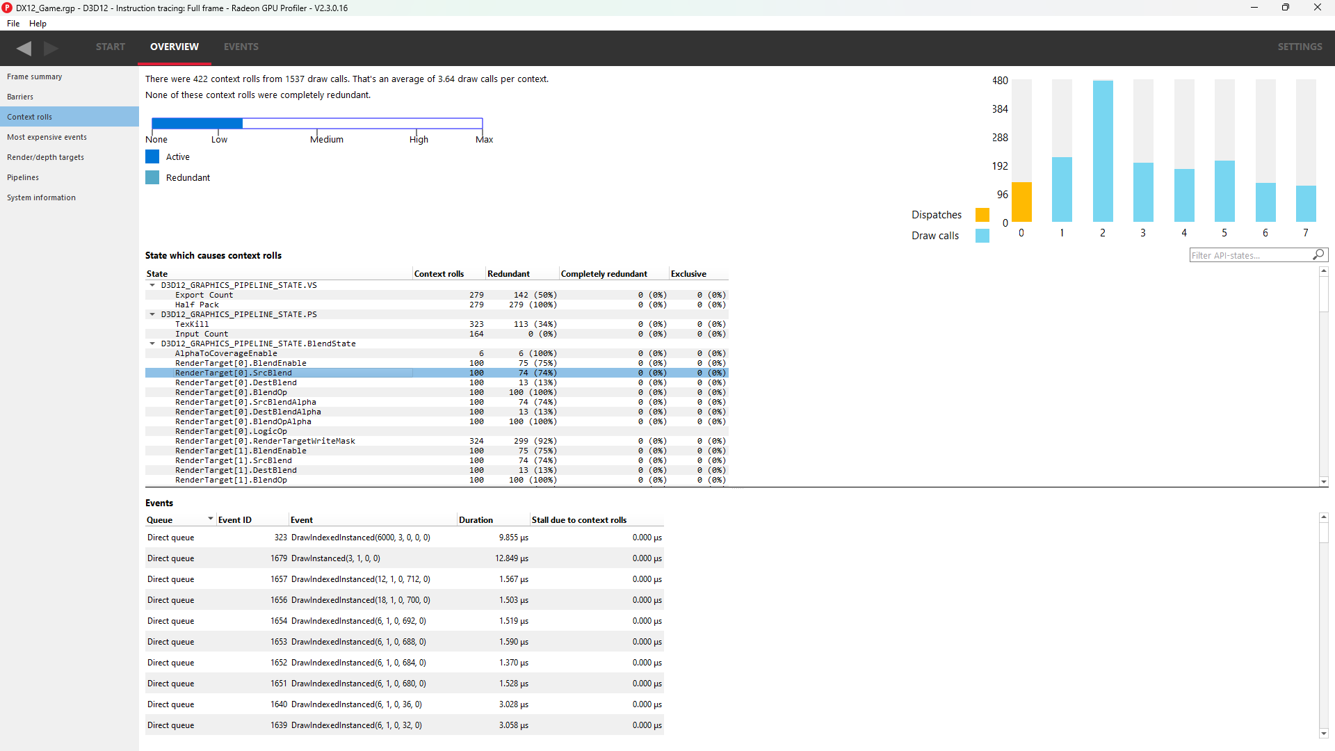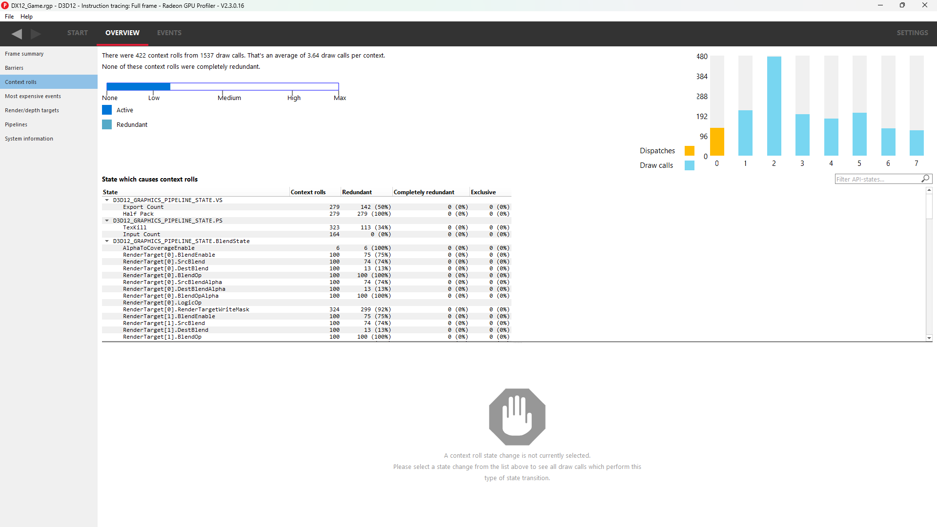 在上例中,一个 DirectX 12 应用程序,我们可以看到帧中有 223 个上下文回滚,其中没有一个是冗余的。Radeon GPU Profiler 会比较状态变化之间的上下文寄存器值,以计算上下文回滚是否冗余。冗余上下文回滚可能由应用程序和驱动程序引起。无效的绘制批处理可能是应用程序方面的原因。