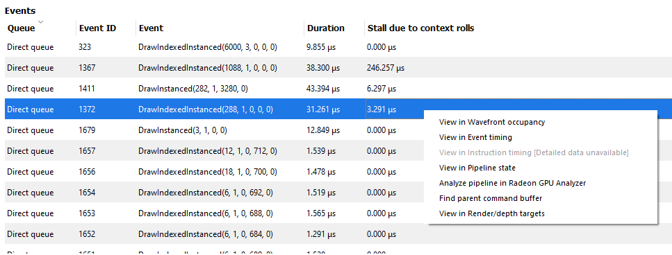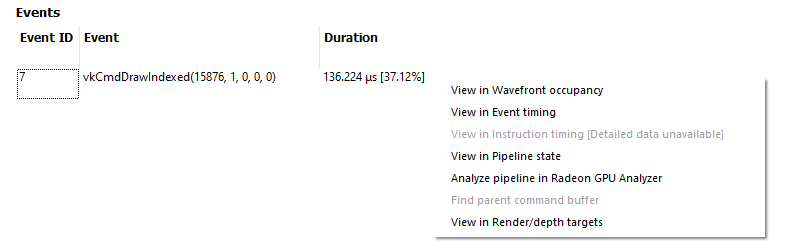 用户可以通过右键单击“详细 GPU 事件”区域中的命令缓冲区来关联命令缓冲区计时数据和 SQTT 数据。这将打开一个上下文菜单,其中包含三个菜单项,用于查找所选命令缓冲区中的第一个事件。选择菜单项之一将导航到相应的窗格并将焦点设置在指定的事件上。