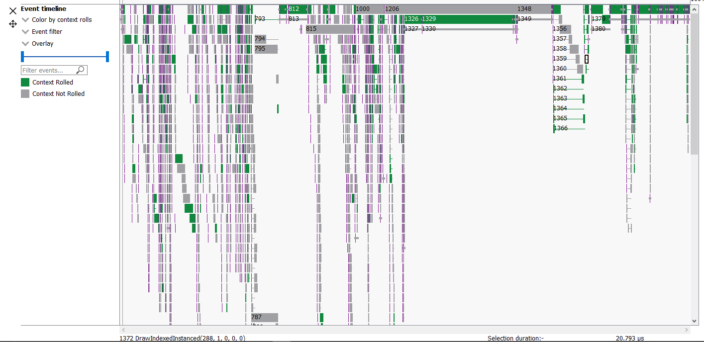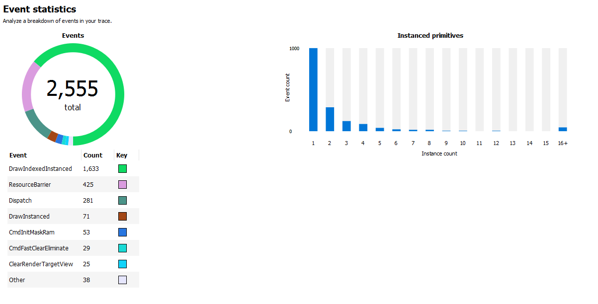 事件统计饼图和表格显示按类型着色的事件计数。在上例中,有 281 个 Dispatch 和 1,633 个 DrawIndexedInstanced 事件。实例化图元直方图显示了绘制 N(1 到 16+)个实例的事件数量。在上例中,我们看到大多数事件只绘制了一个实例,而较少数量的事件绘制了 2-9 个和 16 个实例。