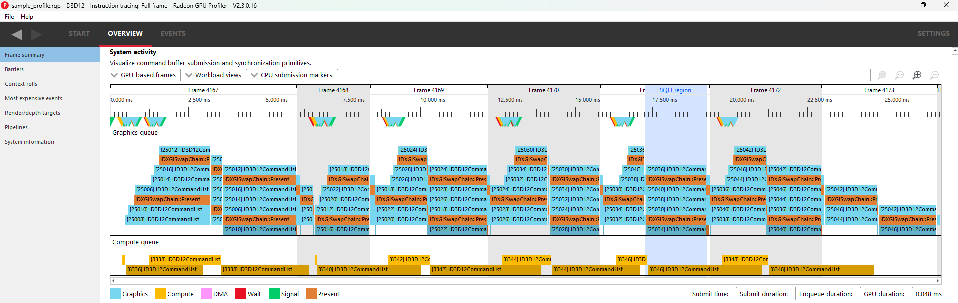 系统活动部分显示了同步操作以及命令缓冲区何时提交到 GPU 的系统级视图。笼统地说,所有配置文件都包含两种类型的数据:命令缓冲区计时数据和 SQTT 计时数据。此窗格显示前者,RGP 的其余部分显示后者。