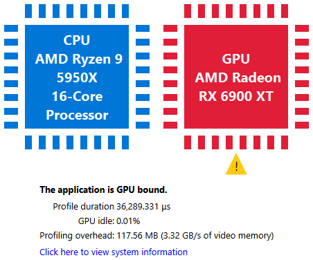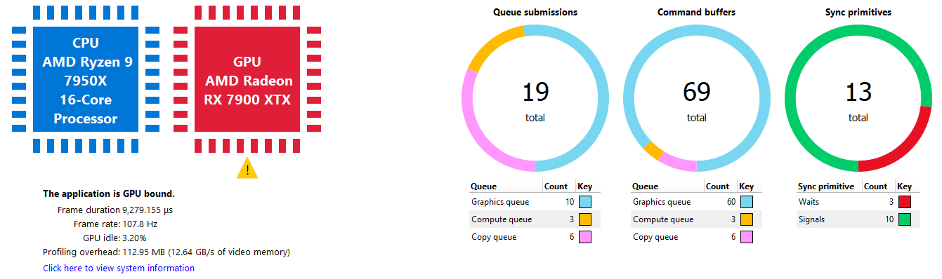 这显示了对队列计时数据的解释,以确定哪个处理器是瓶颈。默认情况下,如果 GPU 空闲时间超过 5%,则该配置文件被视为 CPU 密集型。此百分比可以在 RGP 设置中进行调整。