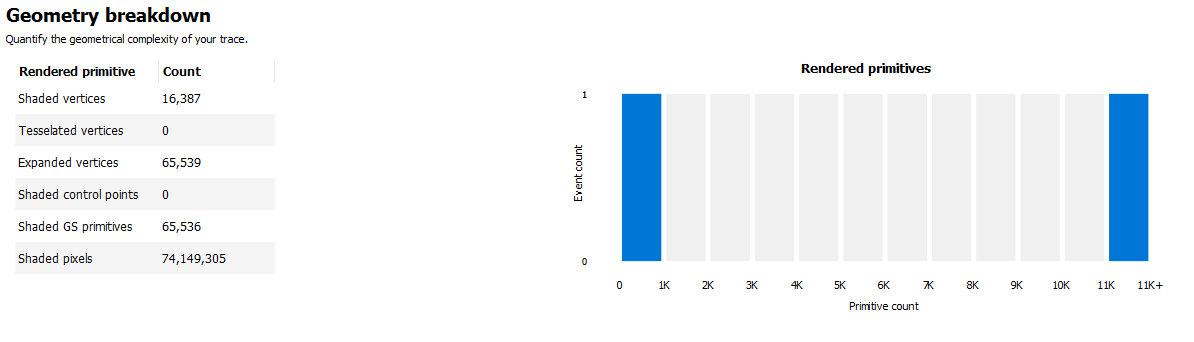注意:如果配置文件中没有渲染图元,则几何细分表和渲染图元直方图将被隐藏,如果配置文件中没有实例化图元,则实例化图元直方图将被隐藏。