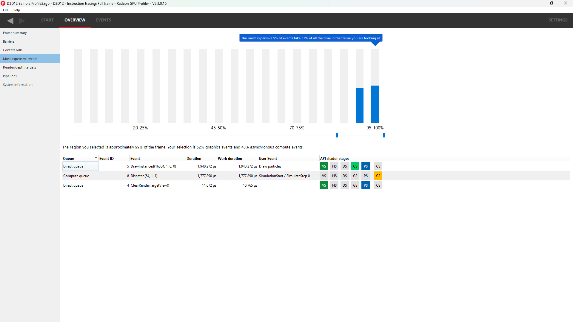 直方图下方是帧的摘要。在这种情况下,最昂贵的 15% 的事件占用了 99% 的帧时间,其中 52% 的选定区域由图形事件组成,48% 由异步计算事件组成。