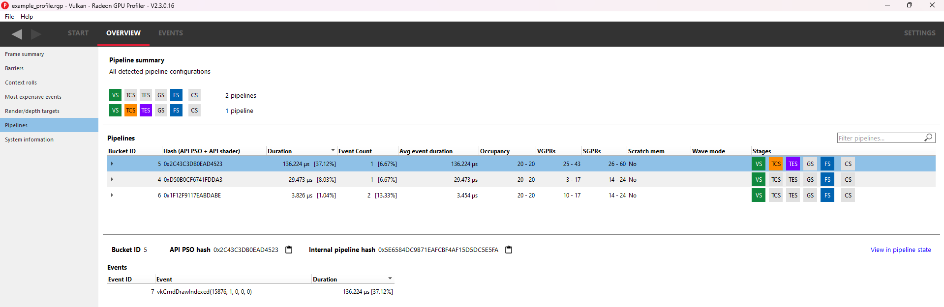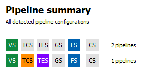 管道摘要部分显示了所有*唯一*管道配置,按 API 着色器阶段着色。