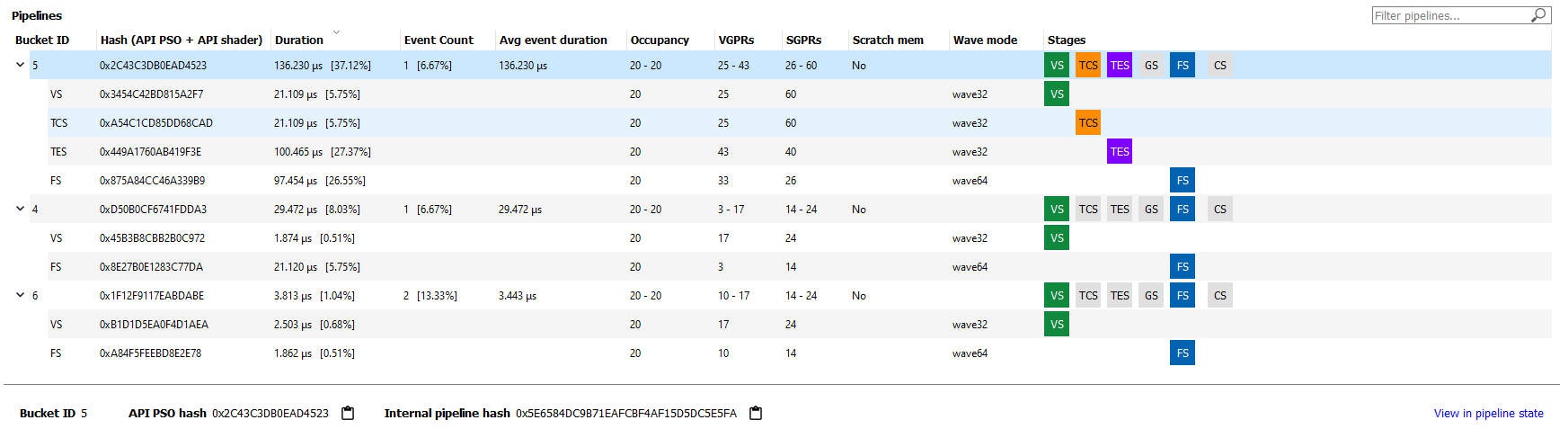 管道 - 显示一个表,其中包含配置文件中*每个*管道的一个条目,以及该管道中*每个*活动着色器阶段的子条目。