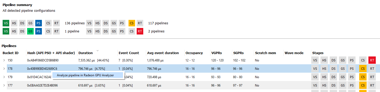 右键单击管道摘要部分中的管道会显示一个上下文菜单,提供“在 Radeon GPU Analyzer 中分析管道”的选项。选择此选项会将管道保存为二进制格式,并在 Radeon GPU Analyzer 中打开该二进制文件。有关更多信息,请参阅Radeon GPU Analyzer 和 Radeon GPU Profiler 互操作部分。