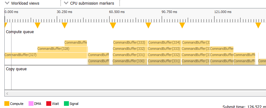 中间是实际视图。每个适用于非基于帧的配置文件的队列(计算、复制)都有自己的部分。请注意,命令缓冲区使用两种相同的颜色阴影进行可视化。较浅的阴影表示到达 GPU 之前花费的时间,较深的阴影表示实际执行时间。