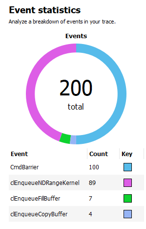 事件统计饼图和表格显示事件计数。对于 OpenCL,各项按 OpenCL API 类型着色。对于 HIP,各项按内核名称(对于分派)或 HIP API 类型(对于其他事件)着色。纯计算 DirectX 和 Vulkan 应用程序的事件按类型着色,类似于基于帧的应用程序。在下面的示例中,有 89 个 clEnqueueNDRangeKernel 调用和 7 个 clEnqueueFillBuffer 调用。CmdBarrier() 的含义在屏障部分进行了解释。