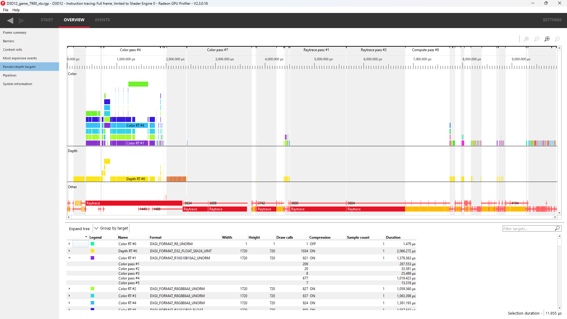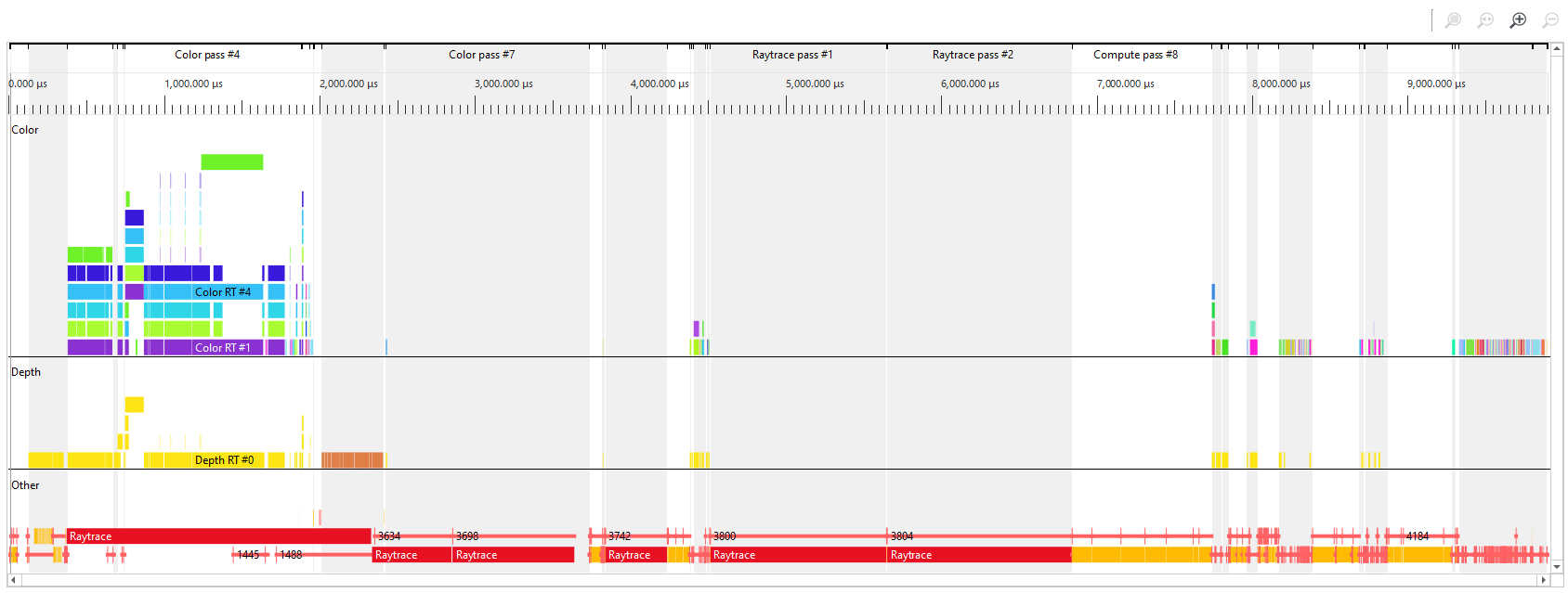 图形时间线视图说明了在帧持续时间内渲染目标的用法。其他事件,如分派、光线追踪分派、复制、清除和障碍物,显示在此视图的底部。