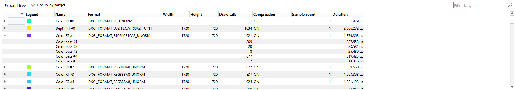 按目标分组 顶级由帧中找到的所有渲染目标以及每帧统计信息组成。子条目显示每个渲染目标的*每通道*统计信息。