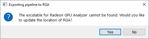如果正在导出的管线二进制文件已存在于磁盘上,将出现一个消息提示,询问是要覆盖该文件还是直接在 RGA 中打开而不覆盖。选择消息提示中的复选框可保存您对未来的选择,不再显示此消息。