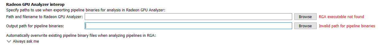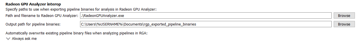 Radeon GPU Analyzer 可执行文件以及保存管线二进制文件的位置可以在常规设置的 Radeon GPU Analyzer 互操作部分进行更改。