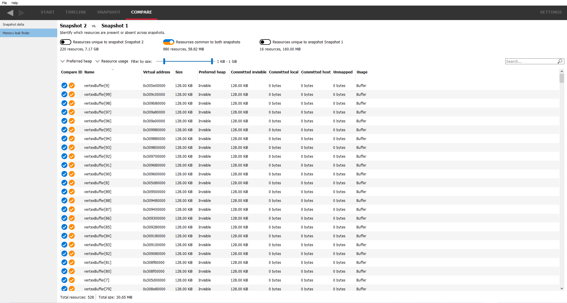 此窗格显示了两个快照中的资源列表,并允许根据它们是仅存在于一个快照还是同时存在于两个快照来过滤它们。可以使用顶部的 3 个复选框来实现此过滤。例如,仅选择中间的复选框将显示两个快照共有的资源。每个复选框下方是该复选框所代表的资源数量以及该复选框使用的总内存量的摘要。例如,最左侧的复选框将显示仅存在于第一个快照中的资源。