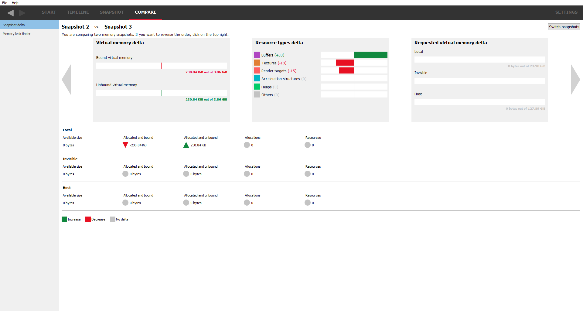 快照差异提供了两个快照之间差异的高级概述。它显示了每个堆类型分配和资源的数量差异。