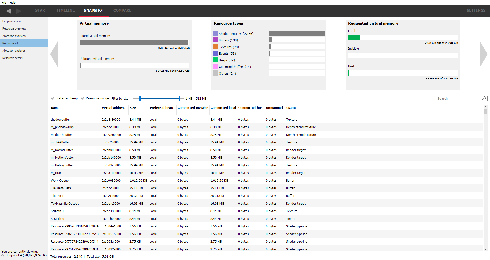 使用 Radeon Developer Panel 捕获的 DirectX 应用程序的内存跟踪可以包含堆、缓冲区和纹理等资源的唯一名称。可以使用 ID3D12Object::SetName() 方法为 DirectX 资源分配名称。有关更多信息,请参阅 Microsoft DirectX 12 文档。
