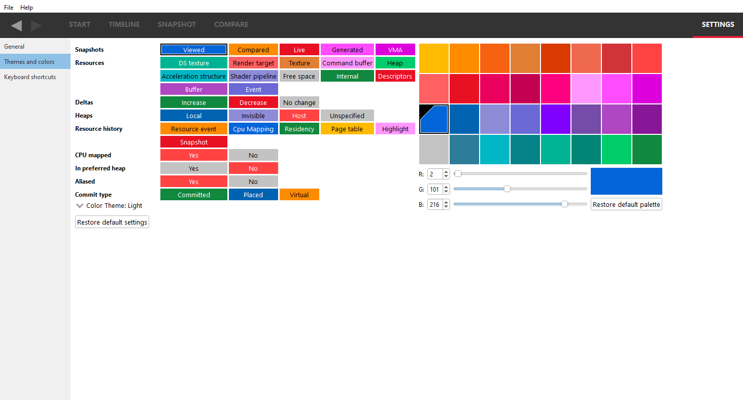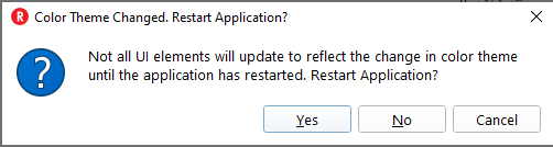 颜色主题: 可以使用“颜色主题”下拉组合框更改颜色主题。这将更改应用程序范围的背景和文本颜色。“浅色”选项保留了 RMV 的默认外观,即白色背景和黑色文本。“深色”选项将 RMV 更改为深色背景和较浅的文本颜色。“检测操作系统”选项使用系统的颜色主题来确定颜色主题应为浅色还是深色。如果无法检测到系统的颜色主题,RMV 将默认使用浅色主题。如果在 RMV 打开且选择了“检测操作系统”选项时更改了系统的颜色主题,则在重新启动应用程序之前不会应用更改。在 Windows 操作系统上,更改颜色主题时会弹出提示,建议重新启动应用程序。这是因为 RMV 的并非所有部分都会在更改颜色主题后更新,直到应用程序重新启动。更改颜色主题不会更改已选择的其他任何颜色自定义选项。