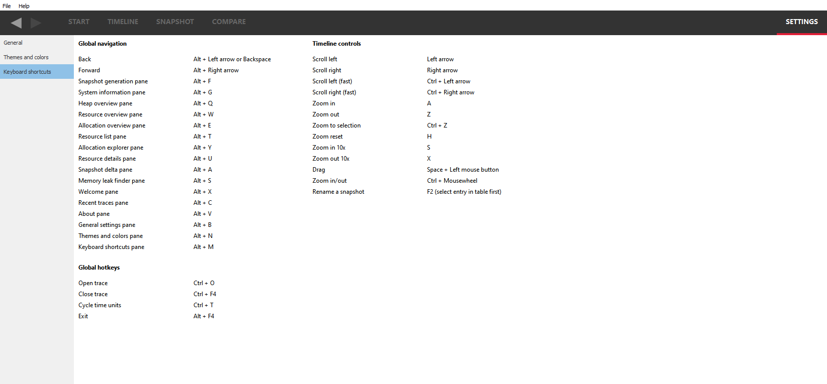 全局热键 部分是指产品中任何位置可用的任何热键。目前,可以通过热键打开和关闭跟踪文件,以及从任何窗格中循环切换不同的时间单位,而无需转到设置。这使您可以非常快速地以时钟周期、毫秒、秒或分钟查看时间轴。