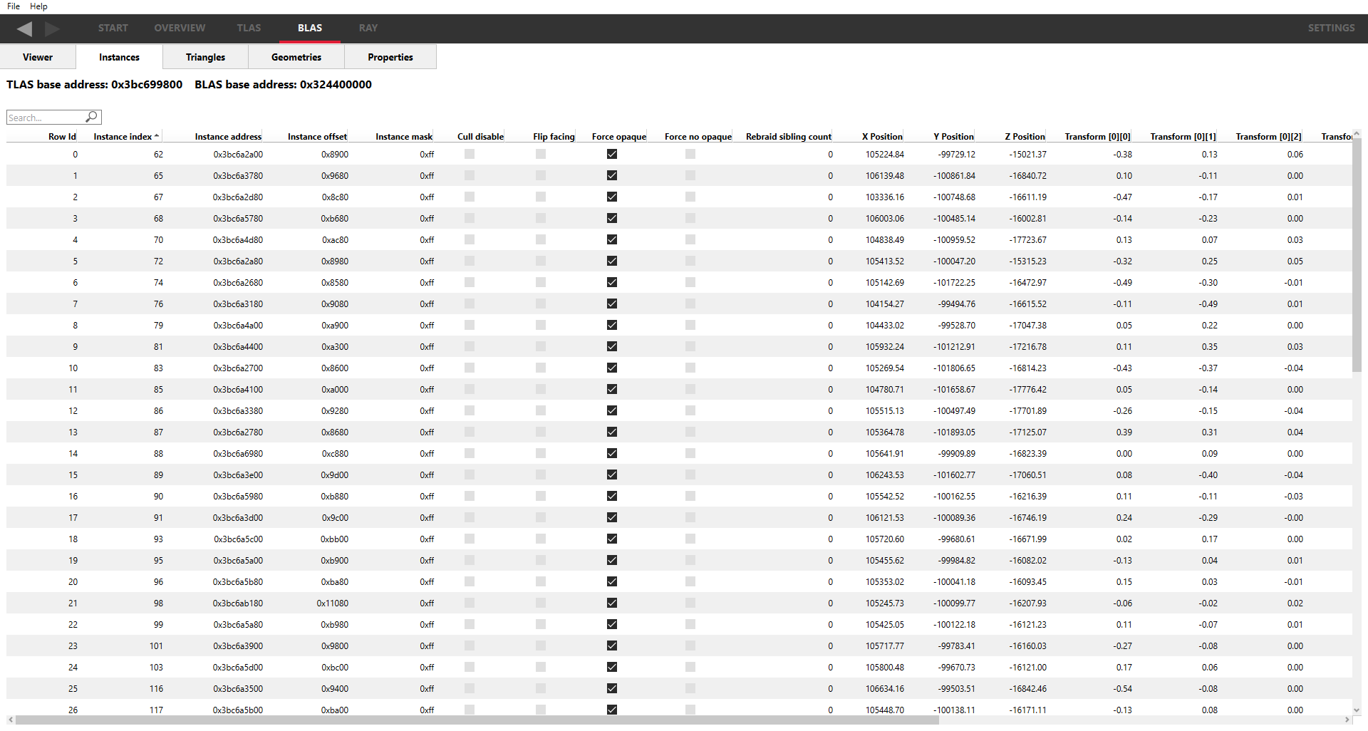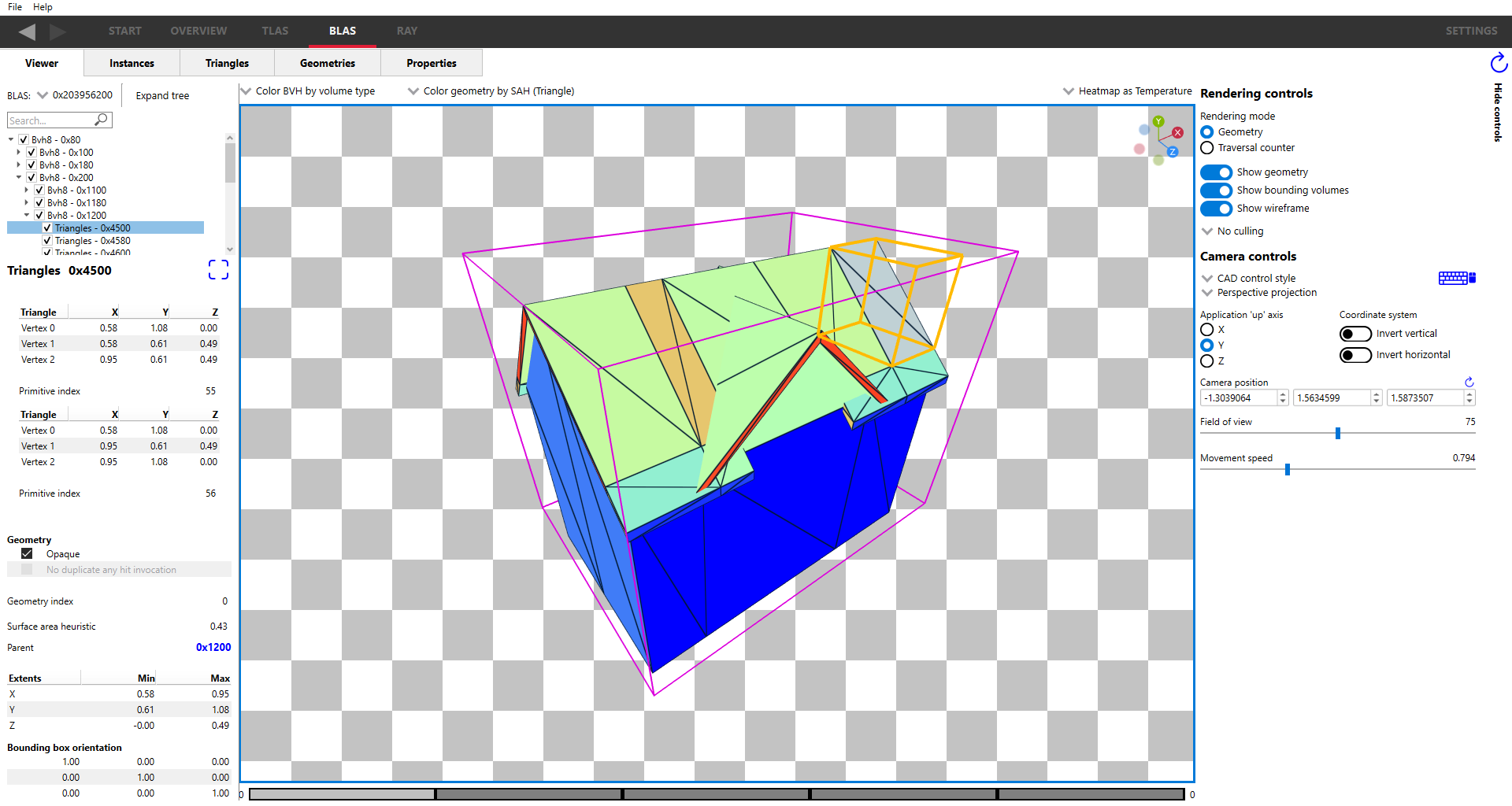 右侧是 TLAS 窗格中看到的相同渲染和相机控件;这些控件的功能几乎相同。唯一区别是 BLAS 窗格中没有显示实例变换的选项。