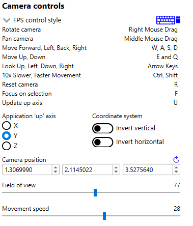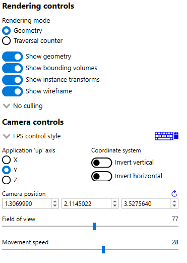 - 组合框允许选择相机控件样式。可以是CAD 控件样式、FPS 控件样式或无轴控件样式,具体取决于用户最熟悉的控件样式,无论是建模(CAD)包还是游戏应用程序(FPS)。无轴相机不会通过与全局向上轴对齐来约束相机。这对于没有自然向上轴的应用程序(如太空探索游戏)很有用。相机设置是全局的,因此在 TLAS 查看器面板上更改相机样式会在 BLAS 查看器面板上选择相同的相机样式,反之亦然。从 CAD 控件样式切换到 FPS 控件样式不会保留 CAD 焦点,因此切换回 CAD 后,您需要再次聚焦到一个实例以围绕它旋转相机。