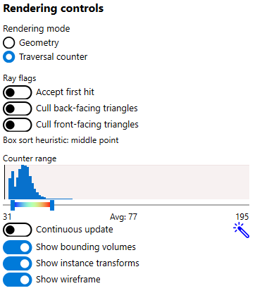 可视化取决于用户通过计数器范围滑块提供的计数器范围。范围由场景布局和选定的计数器类型确定。调整滑块将改变场景的着色。默认情况下,颜色显示为热图,蓝色表示低计数器值,红色表示高计数器值。通常,计数器值越低,场景越优化。此可视化显示了射线遍历的成本,但不考虑影响整体性能的 TLAS 和 BLAS 构建时间。