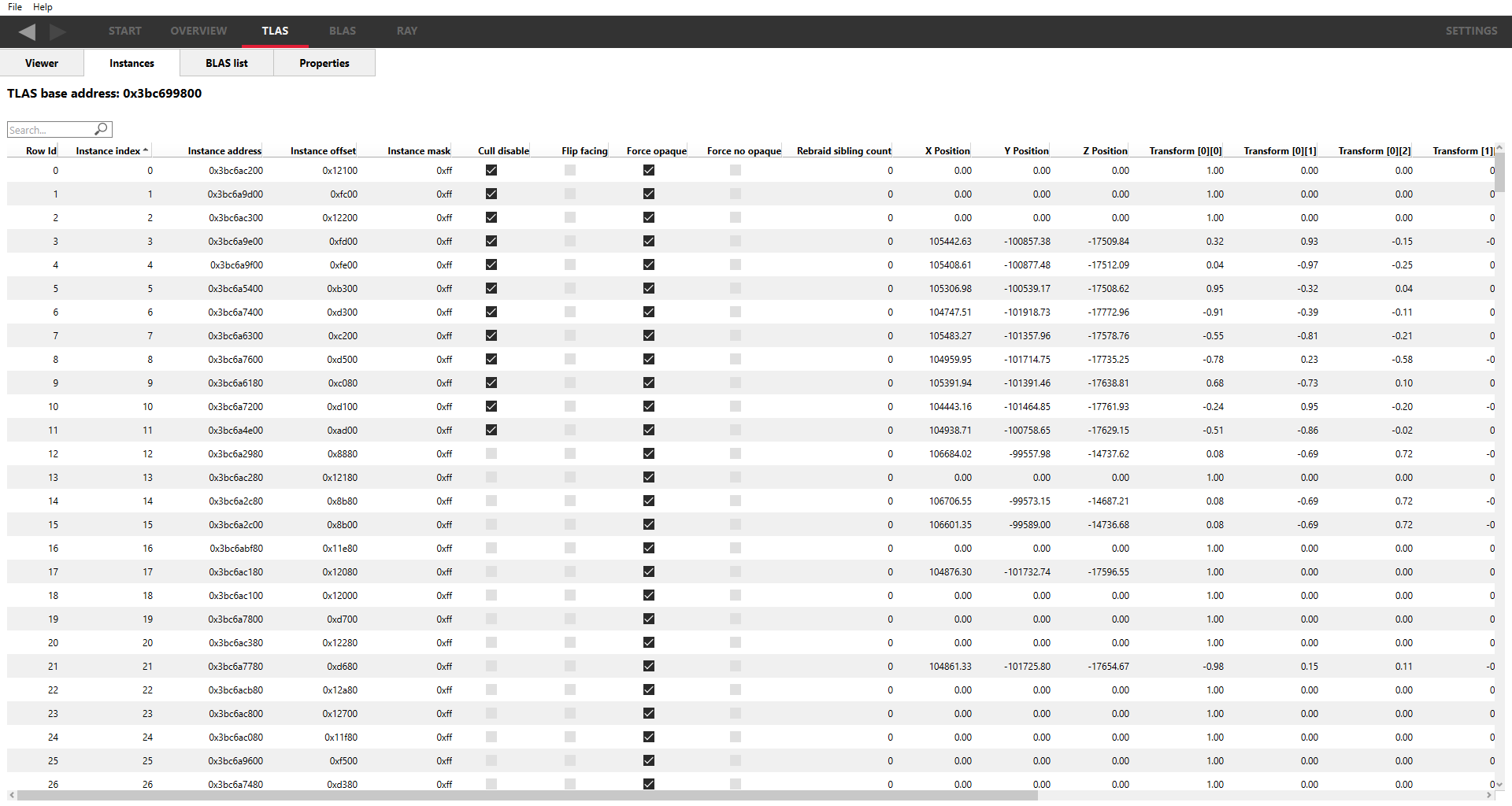 - 如果选定的节点是实例,则会显示传递给 API 的特定于实例的信息,包括实例变换、实例遮罩、标志和 BLAS 地址。单击 BLAS 地址将在 BLAS 选项卡中导航到该 BLAS。实例的位置可以在实例变换的最后一列中找到,以竖线分隔。