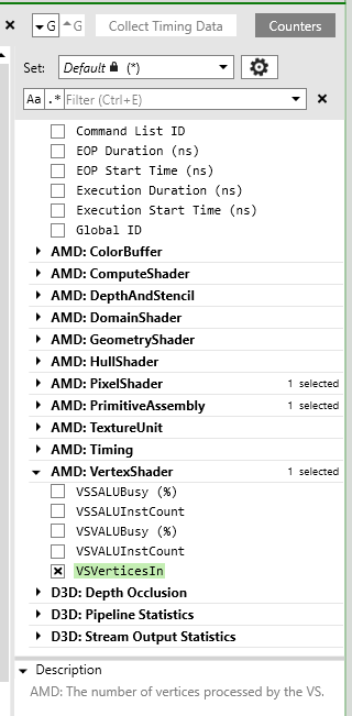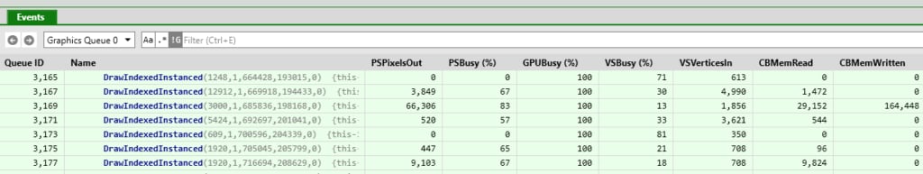 PIX 允许您收集 PIX 捕获执行的每个命令列表中的所有绘图调用的性能计数器。计数器结果会显示在 PIX 的 Events 视图中。