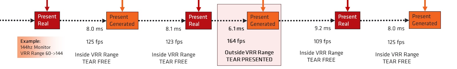 FSR 3 试图以尽可能小的帧间变化来控制帧率,同时考虑到在回调中需要完成的任何额外的 UI 渲染工作。这使得 VRR 行为良好,如下所示。
