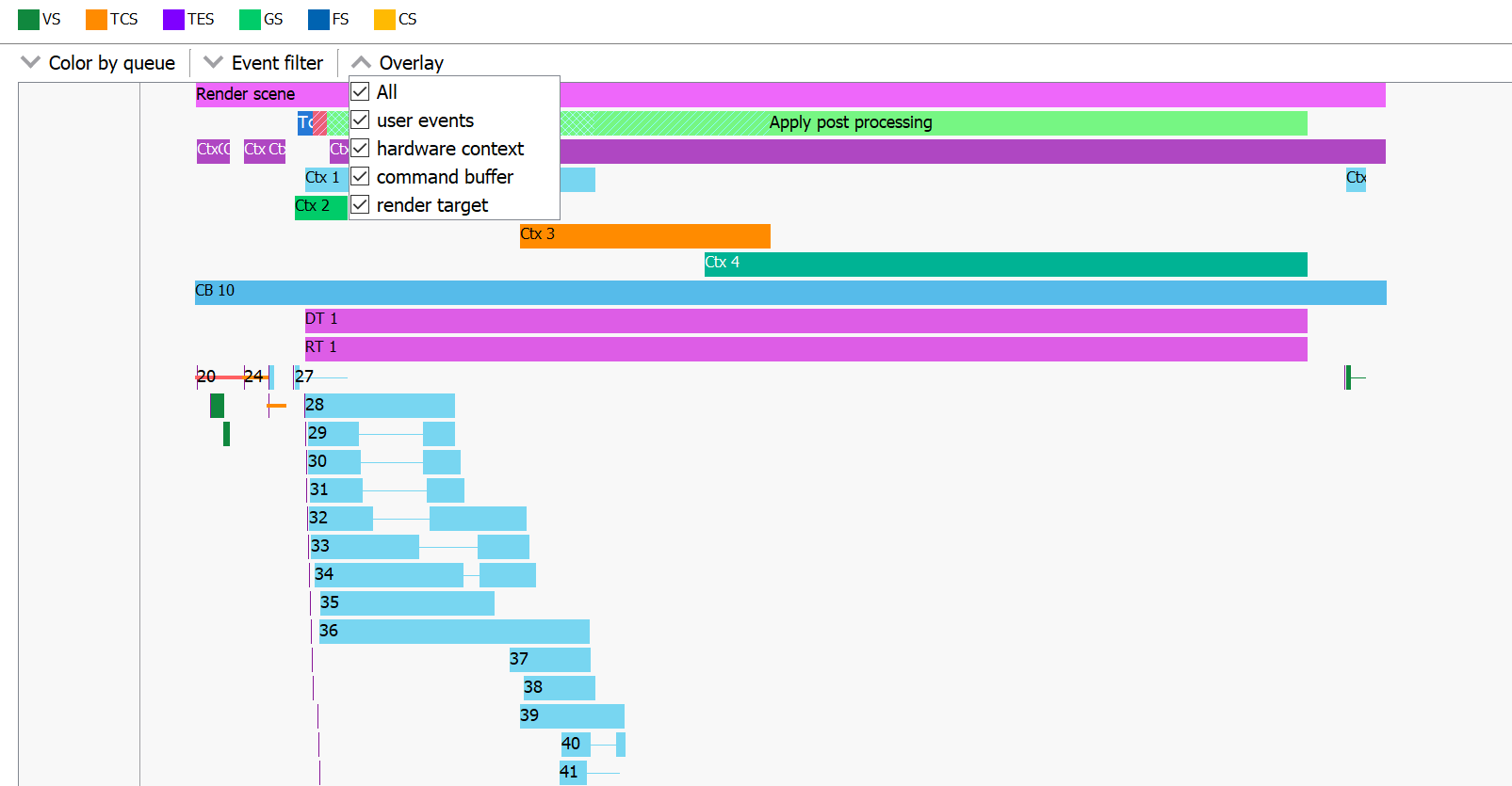接下来,波前占用视图中的时间线现在包含多个叠加层,允许您在 GPU 事件旁边可视化额外数据。在之前的 RGP 版本中,用户事件显示在时间线的顶部,以提供 GPU 事件的额外上下文。在 RGP 1.7 中,此功能得到了增强,允许可选地显示其他叠加层。支持的新叠加层包括硬件上下文、命令缓冲区和渲染目标。