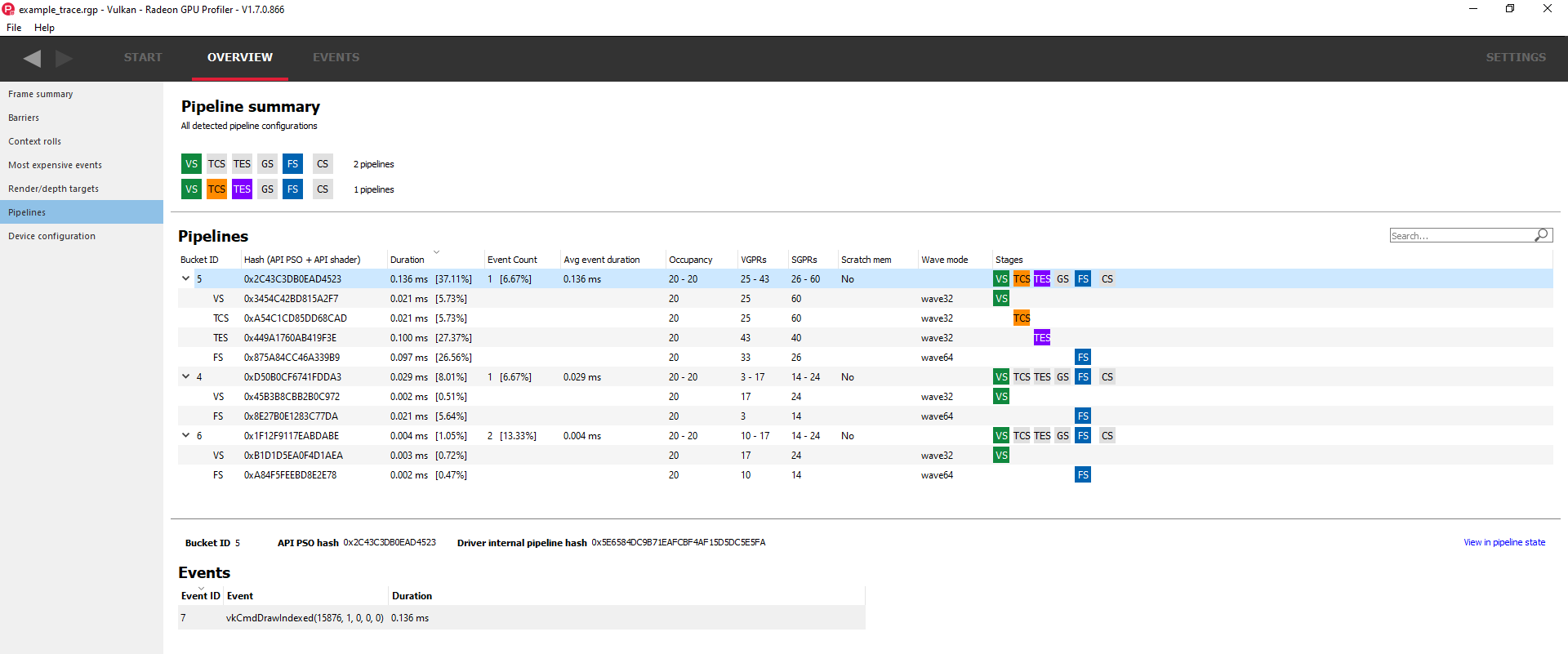 首先,我们添加了一个新的“概述”窗格:管线窗格。此窗格总结了性能分析的管线使用情况,包括有关管线中包含的着色器以及使用该管线的事件的详细信息。在下图可以看到此新窗格。